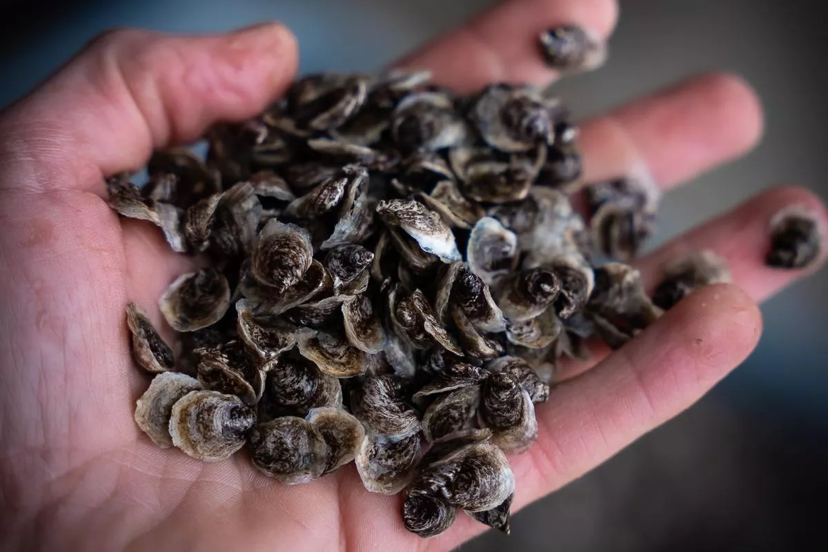 The loop also closes on City Island. Six City Island seafood places — Sammy’s Fish Box, Sammy’s Smokehouse, Tony’s Pier, Johnny’s Reef, Sea Shore, and Seafood City — set their emptied oyster shells aside, where CIOR’s Director of Maritime Field Operations, Frank Williams, and his team collect them from spring through fall and transport them to a curing station at the former Pelham Bay Park Landfill, just across the bridge on the mainland. There, the shells sit in the open for months — sun and time strip off organics and disinfect them. Once cured, the shells go to Cornell Cooperative Extension’s marine program on Long Island, where oyster larvae are set onto them to grow into “spat-on-shell” — living building blocks for new reefs.