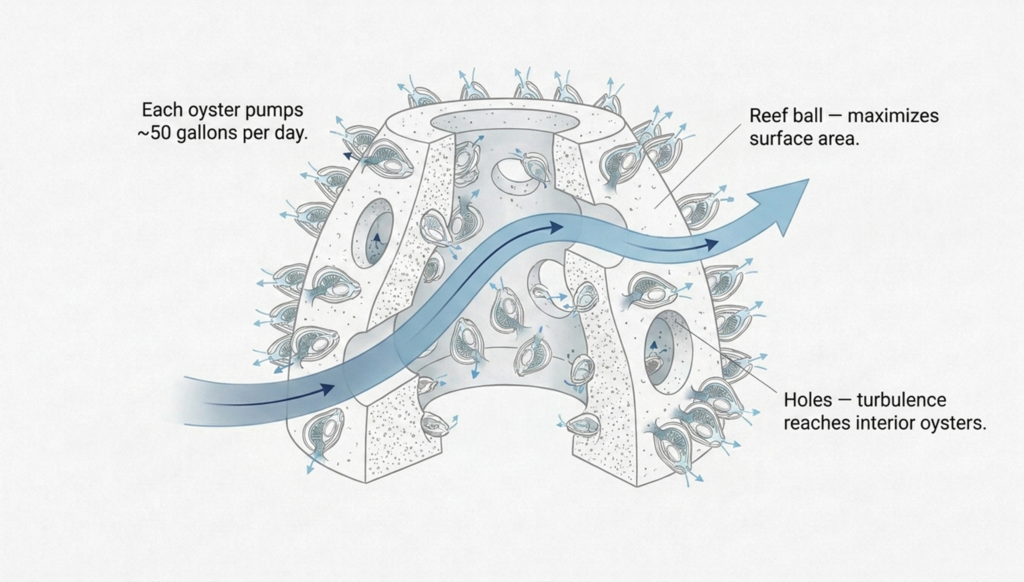 Density is the game. One oyster filtering a bathtub’s worth of water is somewhat of a party trick. But at ecosystem scale, it’s a rounding error. Now cluster thousands of those same oysters onto a single reef structure: reef balls, spat-on-shell, oysters stacked shoulder-to-shoulder, every square foot of seafloor running hundreds of biological pumps in parallel. That’s a filtration system. As we know from the technical world, real, powerful function emerges when you move from a few isolated units to a dense, organized array of them at scale. For oyster filtration: ~50 live oysters per square meter is considered the floor for ecological function.
