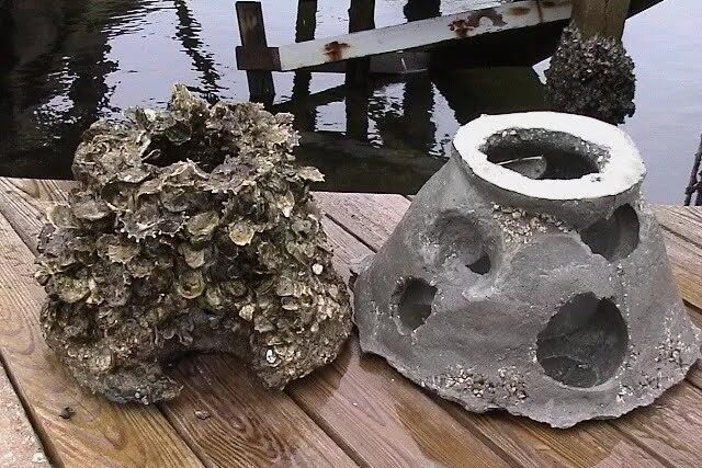 - Build dense reefs — roughly 50 concrete reef balls, each one already covered in baby oysters (the technical term is “spat,” and yes, it’s adorable) plus thousands of pounds of oyster shells, also seeded with spat.