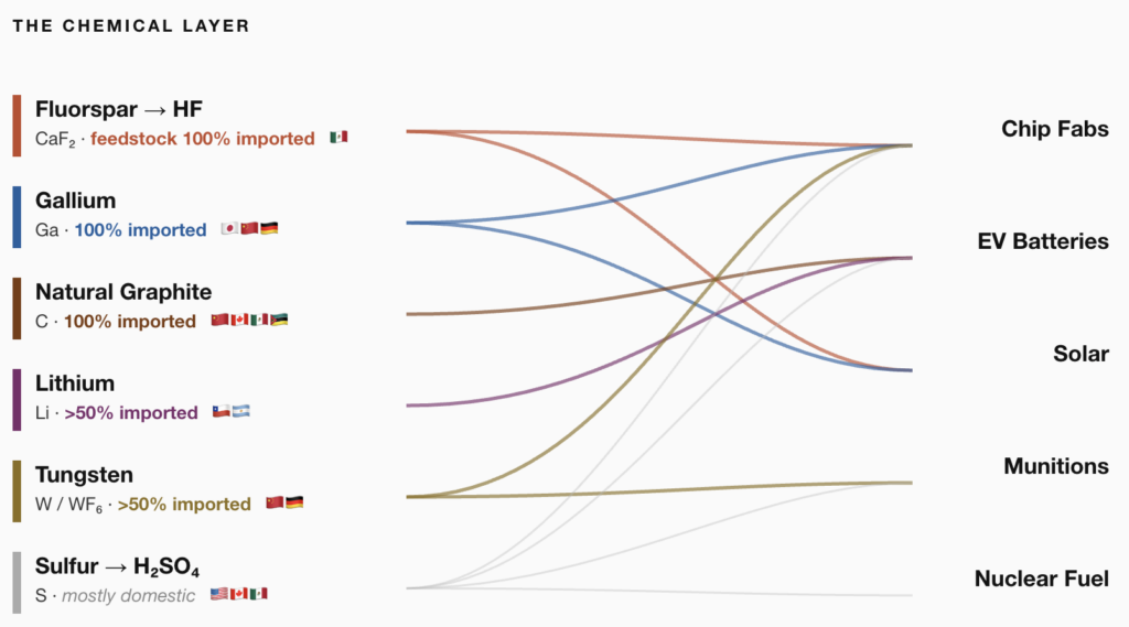 What fabs and gigafactories need is something different: purification chemistry. Hydrofluoric acid distilled in quartz-lined vessels to 99.9999% purity. Lithium recrystallized to electrochemical spec. Solvents cleaned to parts per trillion. Closer to pharmaceutical manufacturing than petrochemicals — and while the US has some domestic capability here, it’s not at the scale the buildout assumes. For the key feedstocks that enter these processes, we’re highly import-reliant.