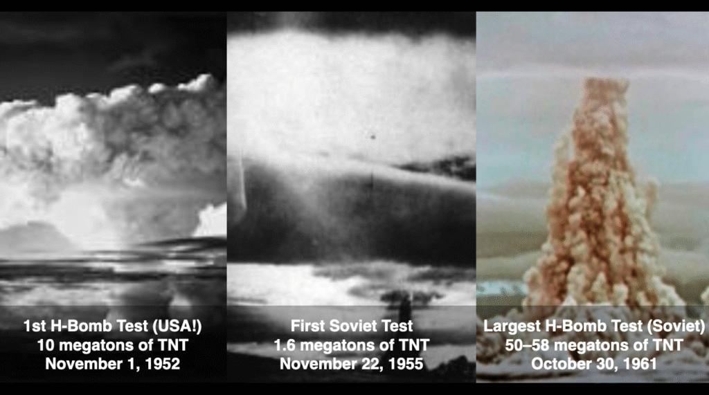that happiness faded, because we were doing duck-and-cover dives in case of an atomic bomb attack. In November 1961, the Russians exploded the largest hydrogen bomb ever — 50 to 58 megatons. It was horrifying.