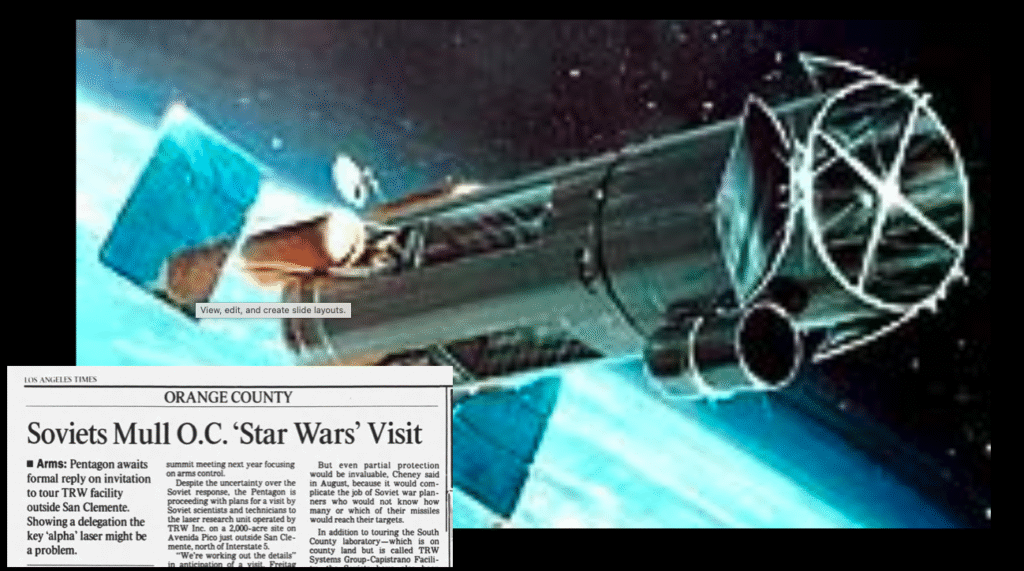 This is the Alpha laser. It’s a directed-energy weapon. And just before George H. W. Bush met with Mikhail Gorbachev to discuss peace, he asked a group of Russian generals and scientists to come to America and come to the directed-energy lab that I oversaw. That’s the device. Whoops, they actually announced it in the paper.